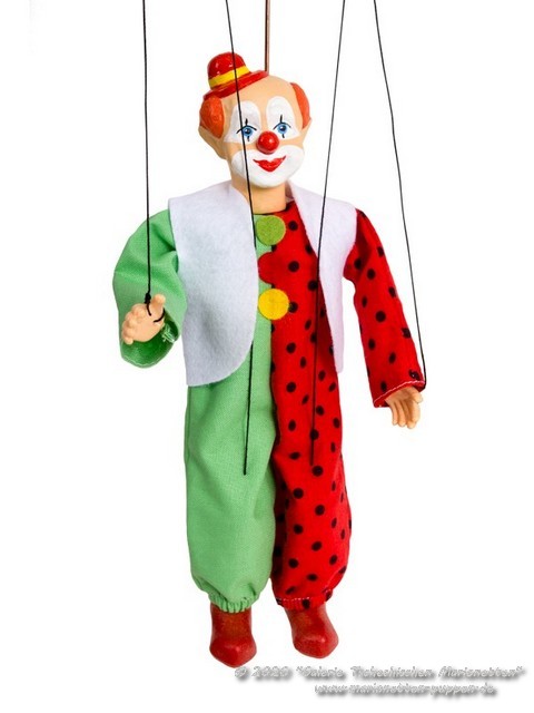 An Fäden hängende klassische tschechische Marionette puppe Clown wird mithilfe einer „Münsberger Rolle“ in Bewegung gebracht. Die handgemachten Marionetten sind in kleinen Serien nach einer traditionellen Technologie hergestellt. Kopf, Beine und Arme sind aus modifiziertem Bildhauergips gegossen, und der Körper aus Lindenholz gefertigt. Formgestaltung der Puppe sowie die Kleidung sind im Stile historischer Marionetten hergestellt. Marionetten sind mit einem unschädlichen wasserdichten Farbstoff, der für Kinderspielzeuge geeignet ist, von Hand gefärbt. Die Puppen können auch als Lernspielzeuge für Kinder von 6 Jahren oder als außergewöhnliche Souvenirs aus Tschechien, oder originelle Geschenke benutzt werden.