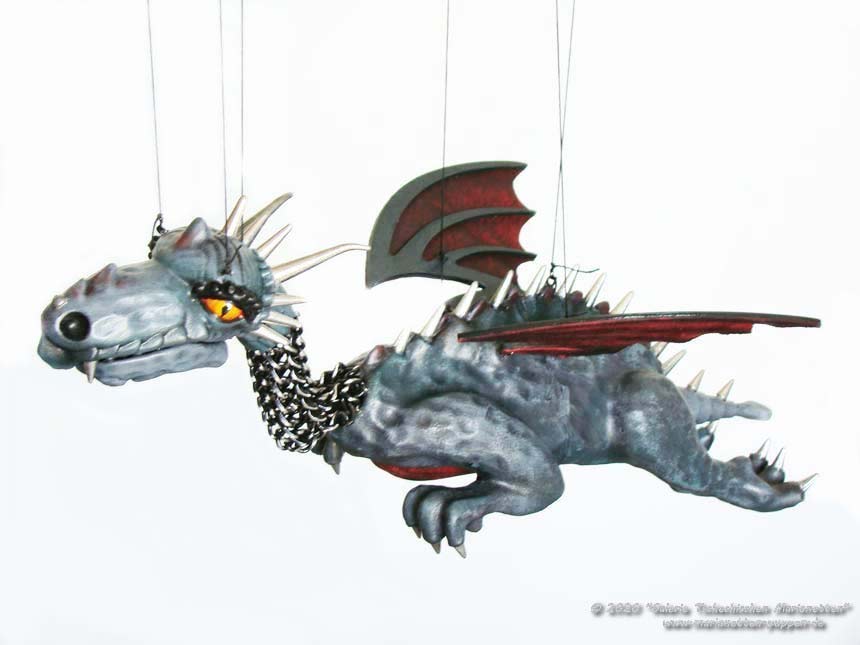 Drache Klassisches Skelett der Marionette , sowie Beine und Schuhe sind aus Holz hergestellt. Kopf und Arme der Marionette sind aus einem speziellen schlagfesten elastischen Stoff produziert. Die Puppenkleidung wurde aus Naturstoffen - aus Flachsmaterial, Baumwolle und aus Leder von Hand hergestellt. Die Marionette wird mithilfe eines kreuzartigen Waagebalkens, Metalldrahts und der Fäden in Bewegung gebracht. Das Betätigungssystem sichert eine richtige Freiheit in den Bewegungen der Puppe. Die Puppe kann als ein originelles Geschenk, Kinderspielzeug benutzt, sowie in Haustheatervorführungen eingesetzt werden.