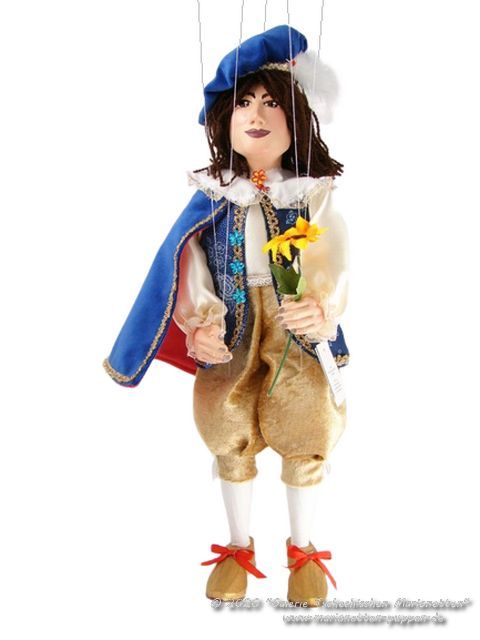Prinz dekorative tschechische Gliederpuppe wird mithilfe von Fäden und einem besonderen kreuzartigen Waagebalken (Waage) betätigt. Körper der Marionette, sowie Beine und Schuhe sind aus Holz hergestellt. Kopf und Arme der Marionette sind aus spezieller Masse, die bei der Bildhauerei benutzt wird, hergestellt. Kleider sind aus unterschiedlichen Textilien, Naturstoff, Flachsmaterial, Baumwolle und Leder gefertigt. Puppe ist mit unschädlichen wasserdichten Farbstoffen von Hand gefärbt. Diese Puppe ist ein ungewöhnliches Geschenk, eine Handarbeit!
