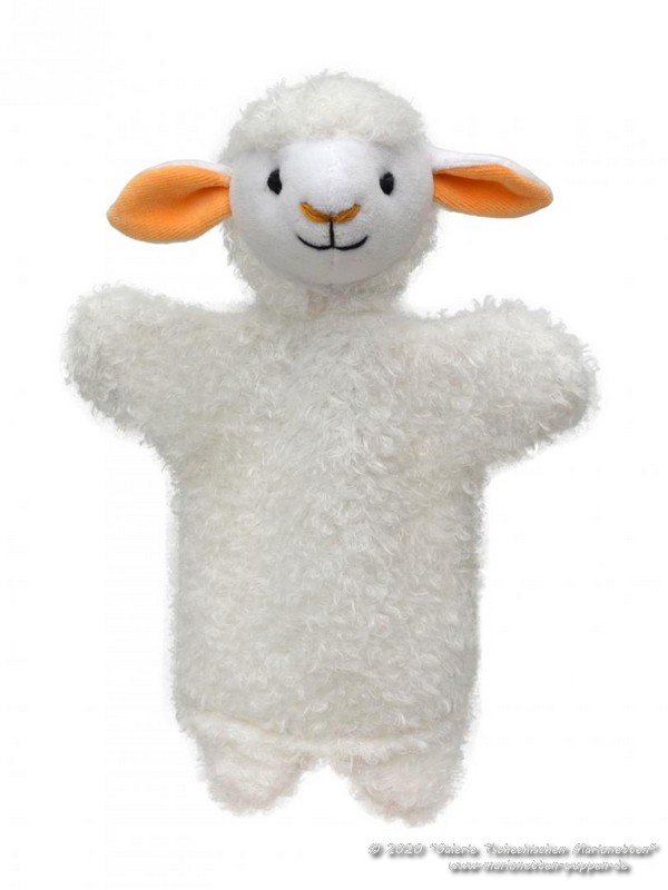 Schäfchen Liza Textilhandpuppe Plüschtier. Wird über die Hand gezogen und mithilfe von Fingern bedient. Kopf und Körper aus Plüsch Textilien hergestellt. Textilhandpuppe mit einem weichen Kopf, geeignet auch für die kleinsten Kinder 0+.