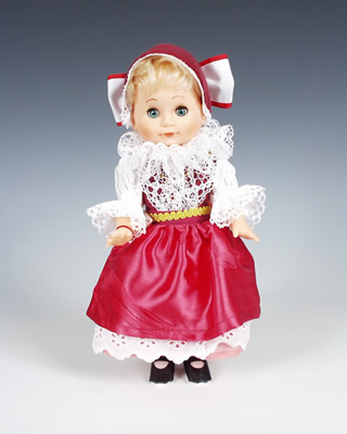 Stil und Design der Tracht widerspiegeln Landestrachten der Tschechischen Republik und der Slowakei. Puppe ist aus Vinil hergestellt. Puppenkleidung wurde von Hand genäht und gestickt. Es wurden Naturstoffe, nationale Methoden und Traditionen bei deren Herstellung verwendet.