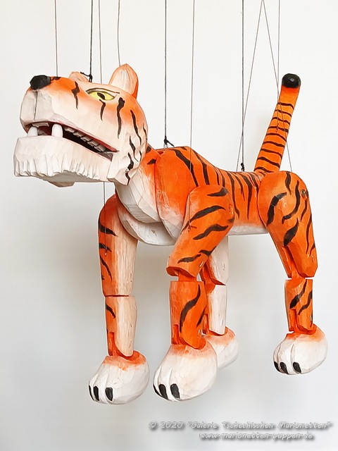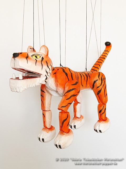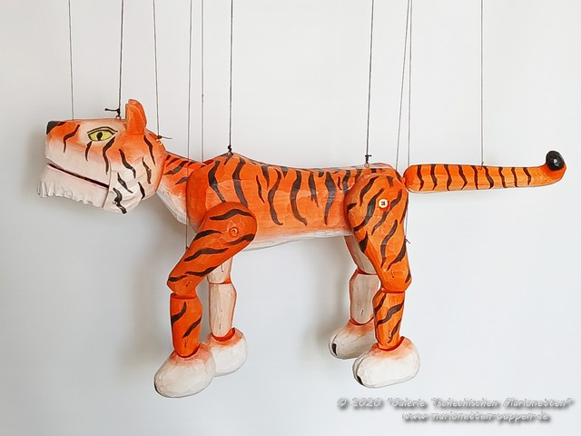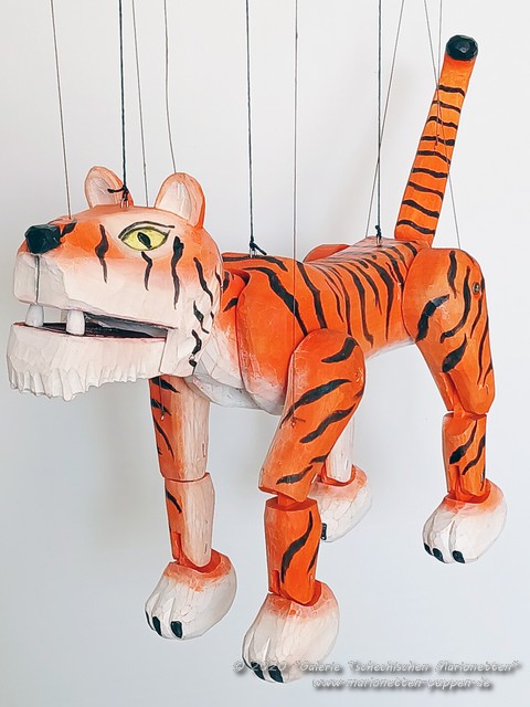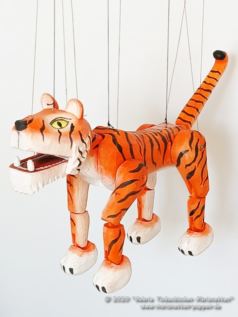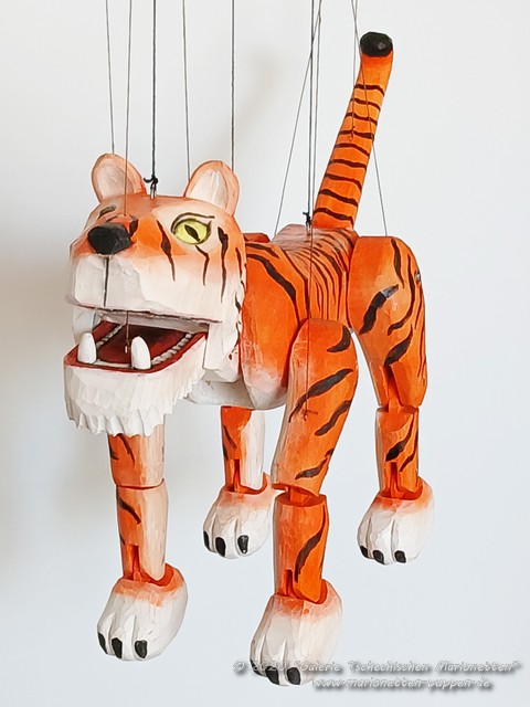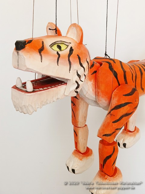 Der Tiger marionette aus holz ist nach einer klassischen Technologie aus Lindenholz geschnitzt worden.