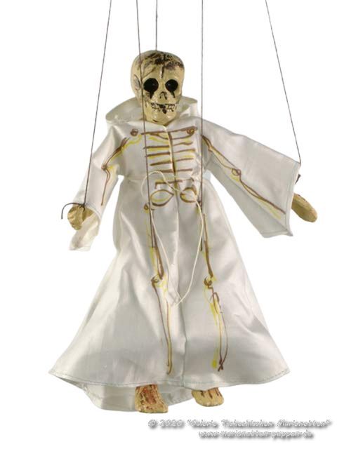 Tod An Fäden hängende klassische tschechische Marionette wird mithilfe einer „Münsberger Rolle“ in Bewegung gebracht. Die handgemachten Marionetten sind in kleinen Serien nach einer traditionellen Technologie hergestellt. Kopf, Beine und Arme sind aus modifiziertem Bildhauergips gegossen, und der Körper aus Lindenholz gefertigt. Formgestaltung der Puppe sowie die Kleidung sind im Stile historischer Marionetten hergestellt. Marionetten sind mit einem unschädlichen wasserdichten Farbstoff, der für Kinderspielzeuge geeignet ist, von Hand gefärbt. Die Puppen können auch als Lernspielzeuge für Kinder von 6 Jahren oder als außergewöhnliche Souvenirs aus Tschechien, oder originelle Geschenke benutzt werden.
