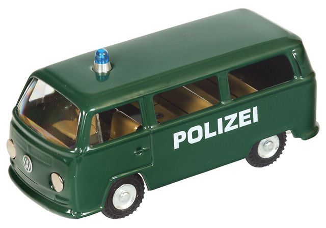 VW Bus T2 Polizei Blechspielware, Hergestellt von der tschechischen Traditionsmarke und bester Qualität. Mechanisches Blechspielzeug. Polizei VW BUS T2 mit Blaulicht. Grün lackiert, mit seitlichem Aufdruck „POLIZEI“