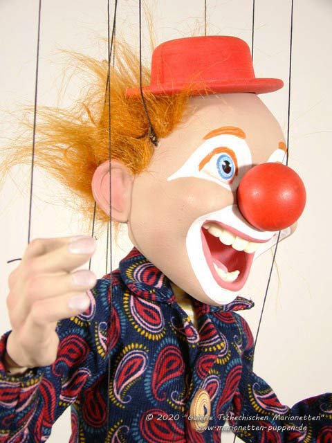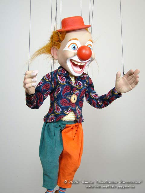 Clown ( Spötter ) Lacher ist Tschechischen der Marionette. Kopf und Arme der Marionette sind aus einem speziellen schlagfesten elastischen Stoff produziert. Die Puppenkleidung wurde aus Naturstoffen aus Flachsmaterial, Baumwolle und aus Leder von Hand hergestellt. Die Marionette wird mithilfe eines kreuzartigen Waagebalkens und der Fäden in Bewegung gebracht. Das Betätigungssystem sichert eine richtige Freiheit in den Bewegungen der Puppe. Die Puppe kann als ein originelles Geschenk, Kinderspielzeug benutzt, sowie in Haustheatervorführungen eingesetzt werden.