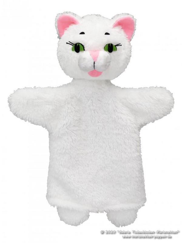 Kätzchen weiss Textilhandpuppe Plüschtier. Wird über die Hand gezogen und mithilfe von Fingern bedient. Kopf und Körper aus Plüsch Textilien hergestellt. Textilhandpuppe mit einem weichen Kopf, geeignet auch für die kleinsten Kinder 0+.