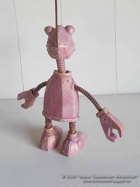 Sein einzigartiges Design ist ein Verdienst unserer großartigen tschechischen Puppenspieler. Der Marionette Roboter besteht aus Dentalkunststoff, wodurch er sehr leicht ist und alle möglichen Tricks ausführen kann. In einer speziellen handgefertigten Technik wurde die Figur mit wasserfesten Naturfarben bemalt.